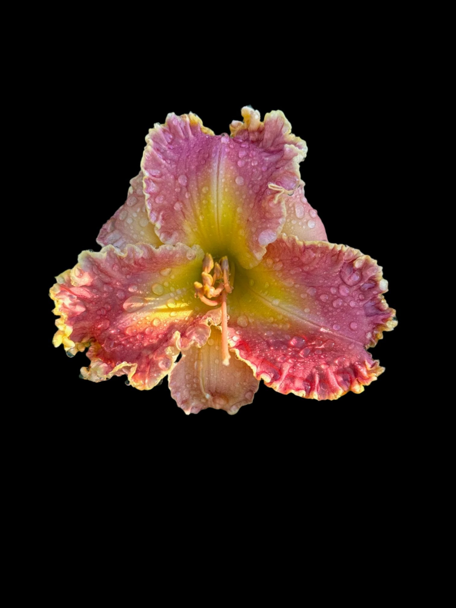 A lullaby of light violet-pink wrapped in fluffy ruffles edged in yellow-cream. The throat is a medium yellow with a flash of ivory midrib cutting through a violet watermark ring. Sepals are diamond dusted cream brushed in pale violet-pink. She is as sweet as the fragrance she emits.