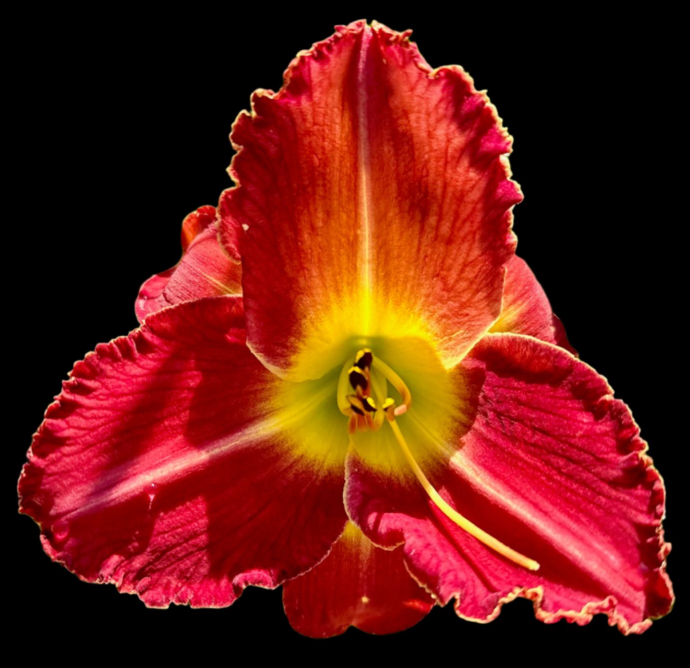 A bright, warm red with peach hues derided by a yellow to ivory midrib. This lily occasionally shows splashes of lighter flashes in the petals. The lightly grooved, bright yellow throat stipples into the petal color. Bright ruffling is edged by a thin cream jagged wire. Sepals recurve with a feathered yellow patch and have a yellow.