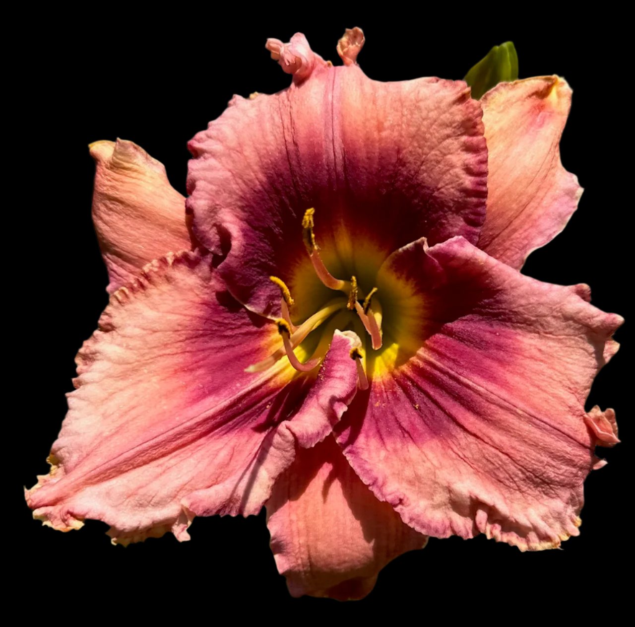 An antique violet-pink with a red-plum feathered eye zone that sends out plum veins. Red stippling rings the green-yellow throat and emerging midribs go form green to red-plum to pink-violet. Petal ruffles are edged in violet picotee and topped with a jagged cream wire. Sepals are apricot and red-plum.