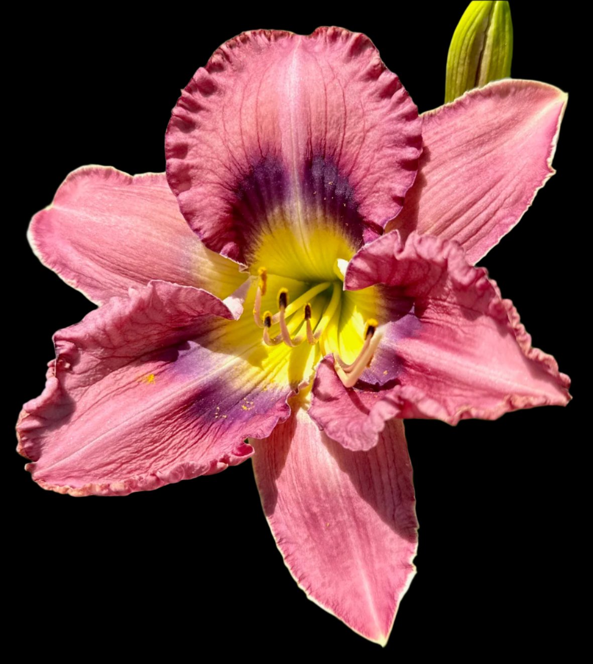 This antique violet-rose liliy has a violet-navy eye zone sending violet veins through the petals. The eye zone stipples into the yellow throat creating an eye-popping contrast. Petals are gently ruffled with a violet edge. Sepals are violet-rose with a yellow patch ringed in violet stippling, and an ivory edge frames the sepal edges.
